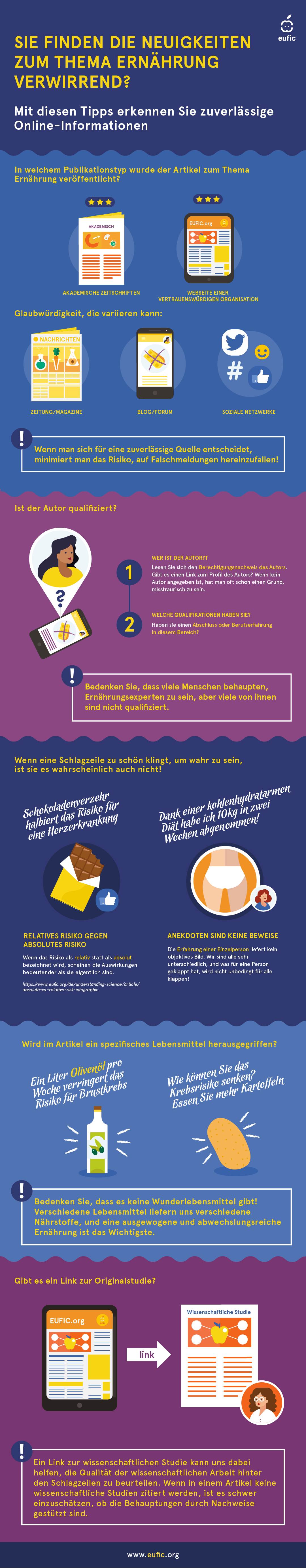 Zuletzt aktualisiert : 12 December 2018Mittlerweile haben wir alle von Falschmeldungen gehört. Wenn es um Neuigkeiten zum Thema Ernährung und Gesundheitsinformationen geht, auf welche Quellen können wir uns wirklich verlassen? Manchmal verweisen einige Artikel auf wissenschaftliche Studien, aber eigentlich entstellen sie die Wissenschaft. Solche Artikel beziehen sich beispielsweise auf das “relative Risiko”, was die Auswirkungen unverhältsmäßiger erscheinen lässt, als sie tatsächlich sind. Die untenstehende Infografik liefert Ihnen mehr Tipps zum Erkennen zuverlässiger Informationen, wenn Sie im Internet oder sonstigen Medienkanälen surfen.