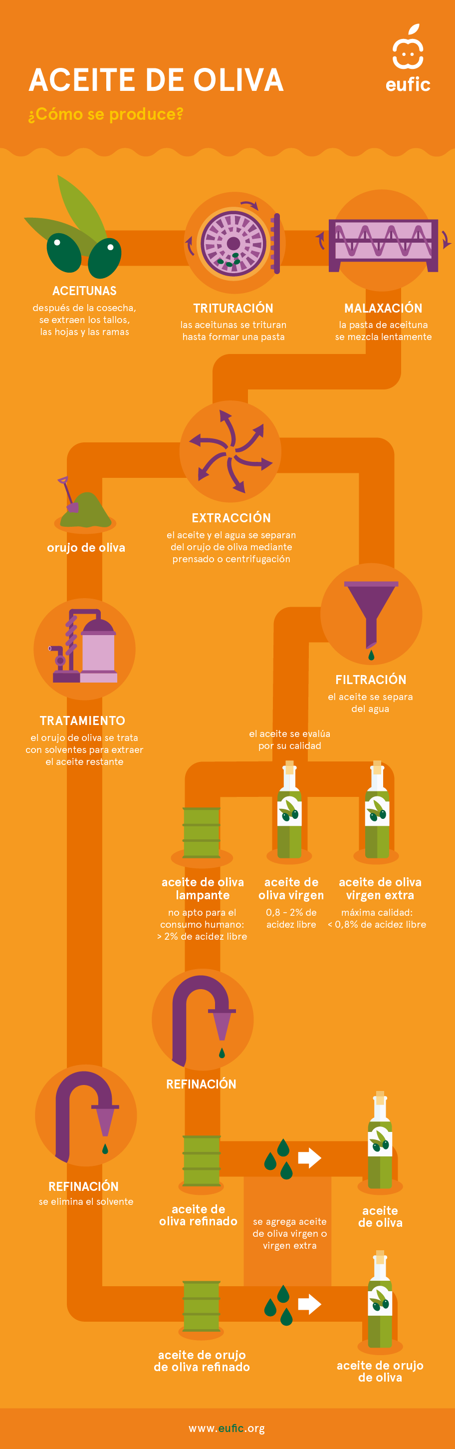 Última actualización : 12 October 2014Mucha gente en todo el mundo disfruta del aceite de oliva. Es rico en grasas monoinsaturadas, vitamina E y polifenol. Como su nombre sugiere, el aceite de oliva se produce del fruto del árbol de oliva Olea europaea. Hay cientos de variedades de olivas, muchas de ellas cultivadas en regiones específicas del mundo. Al igual que el vino, cada variedad de oliva producirá un aceite con un sabor y aroma únicos. El aceite de oliva puede venderse en cuatro categorías diferentes; extra virgen, virgen, aceite de oliva compuesto de aceites de oliva refinados y aceites de oliva vírgenes, y aceite de orujo de oliva. Esta infografía ofrece una visión general de cómo las aceitunas van de una fruta a un delicioso aceite que se utiliza en todo el mundo.