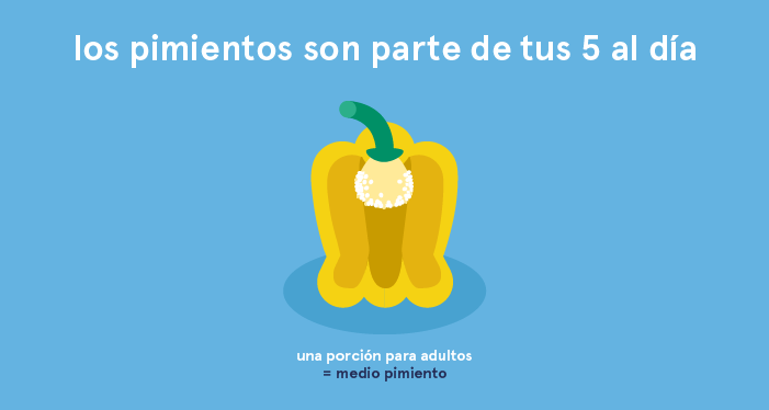 Para las recomendaciones de 5 al día, los pimientos se clasifican como verduras de ensalada, que es la definición culinaria, porque así es como la mayoría de la gente aprende sobre frutas y verduras. Una porción de pimiento para adultos es medio pimiento; recuerda comer una amplia variedad de frutas y verduras para que puedas alcanzar tu consumo diario de 5 al día. 3